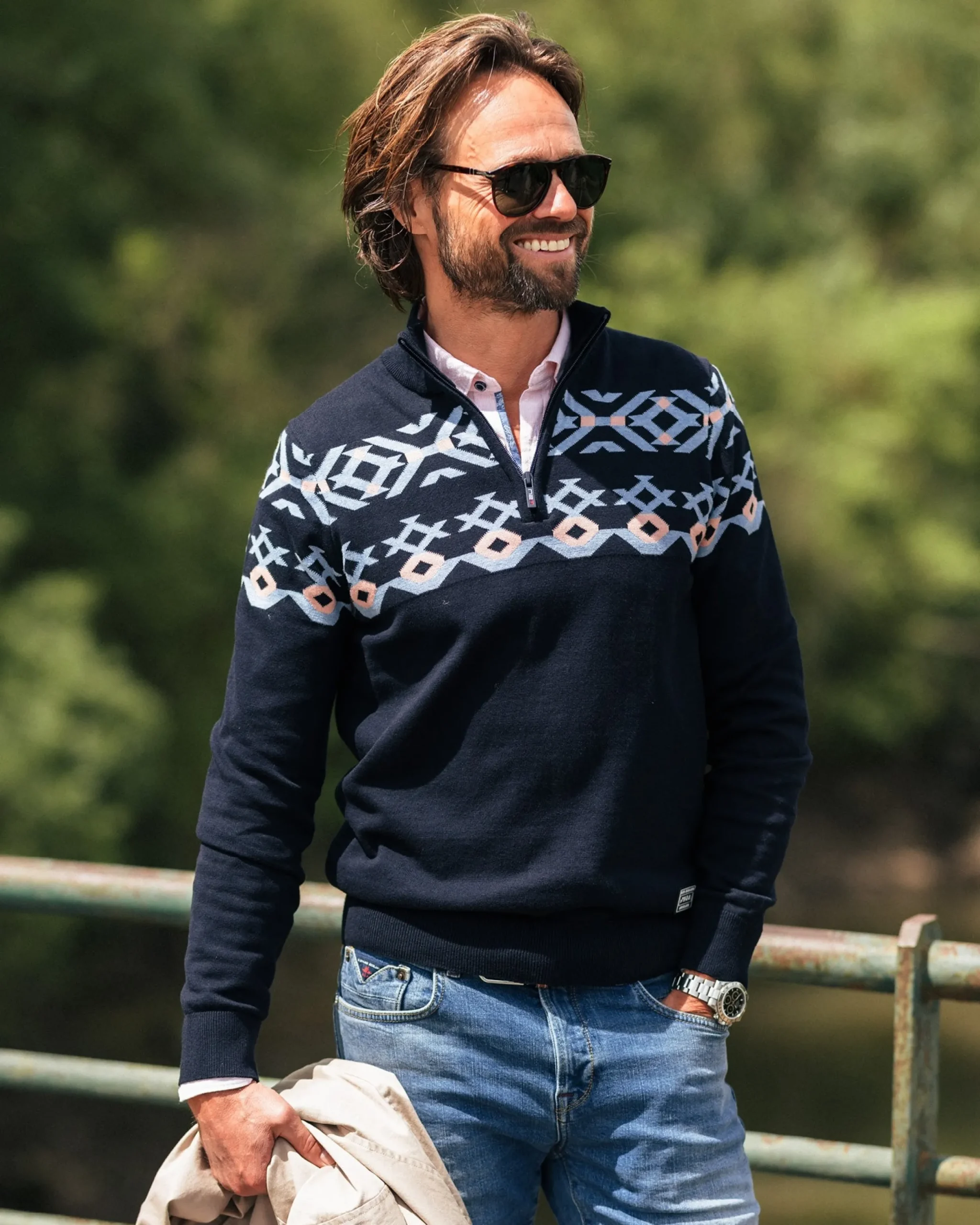 Blauwe katoenen trui met gebreid patroon