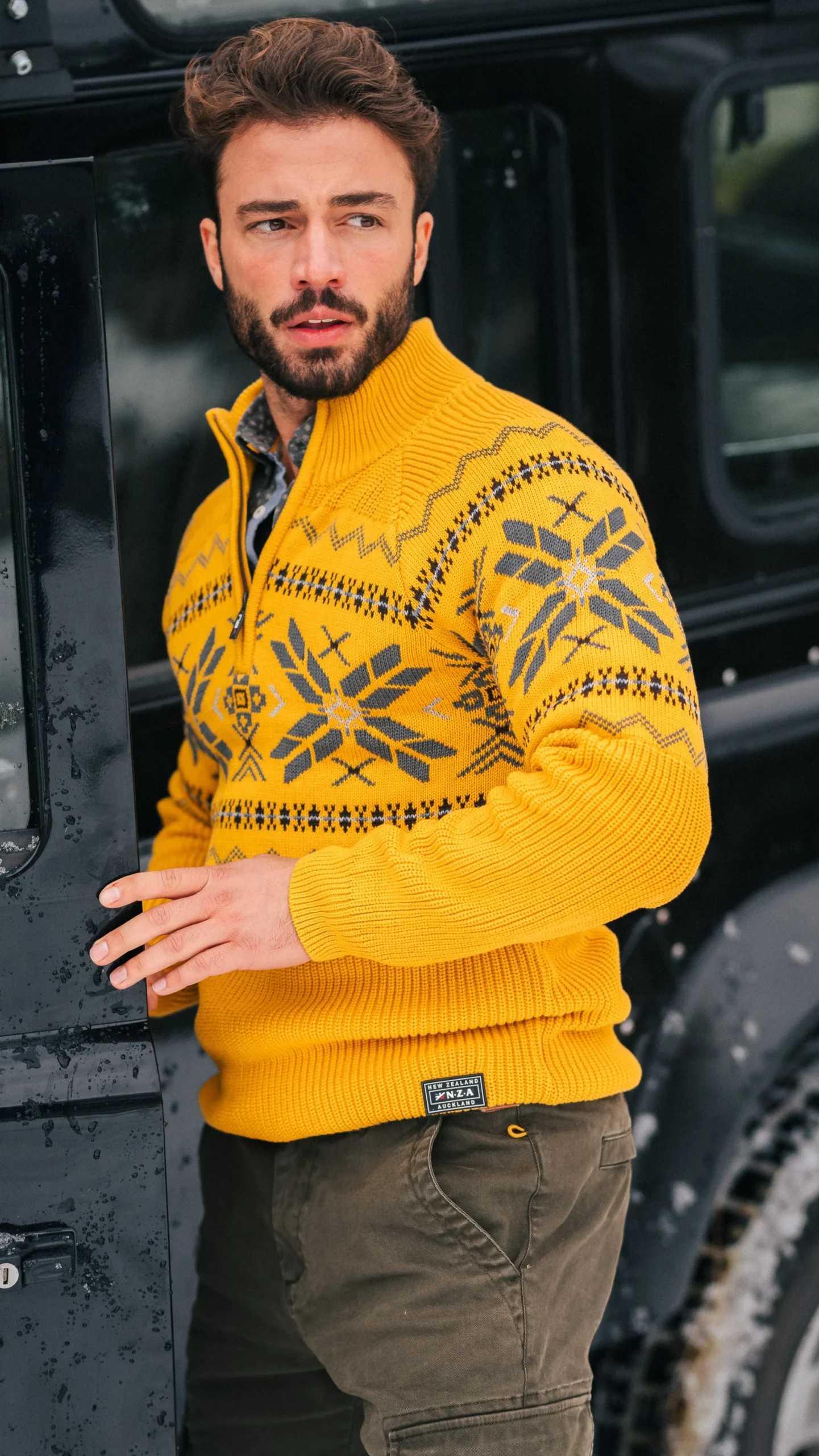 Okergele pullover met halve rits en gekleurd motief – Warm Ocre