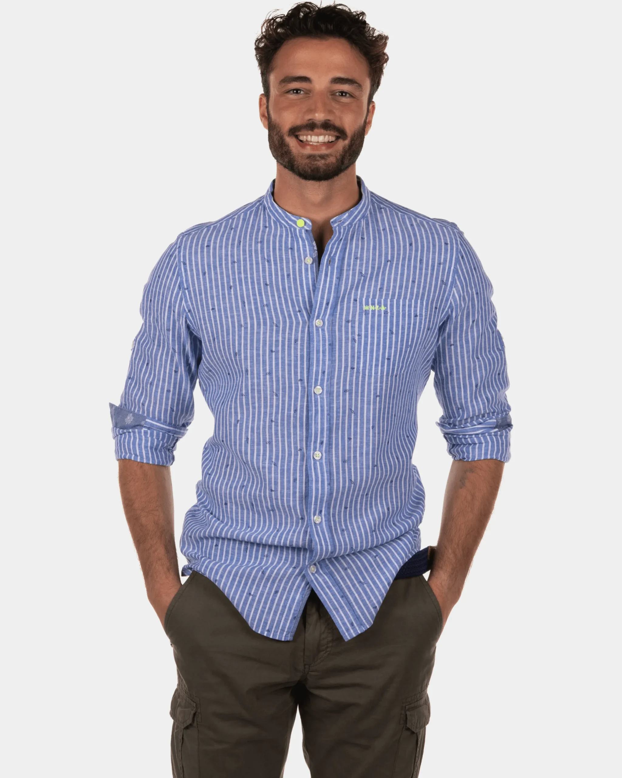 Rotonuiaha gestreept linnen overhemd zonder kraag – Chinese Blue