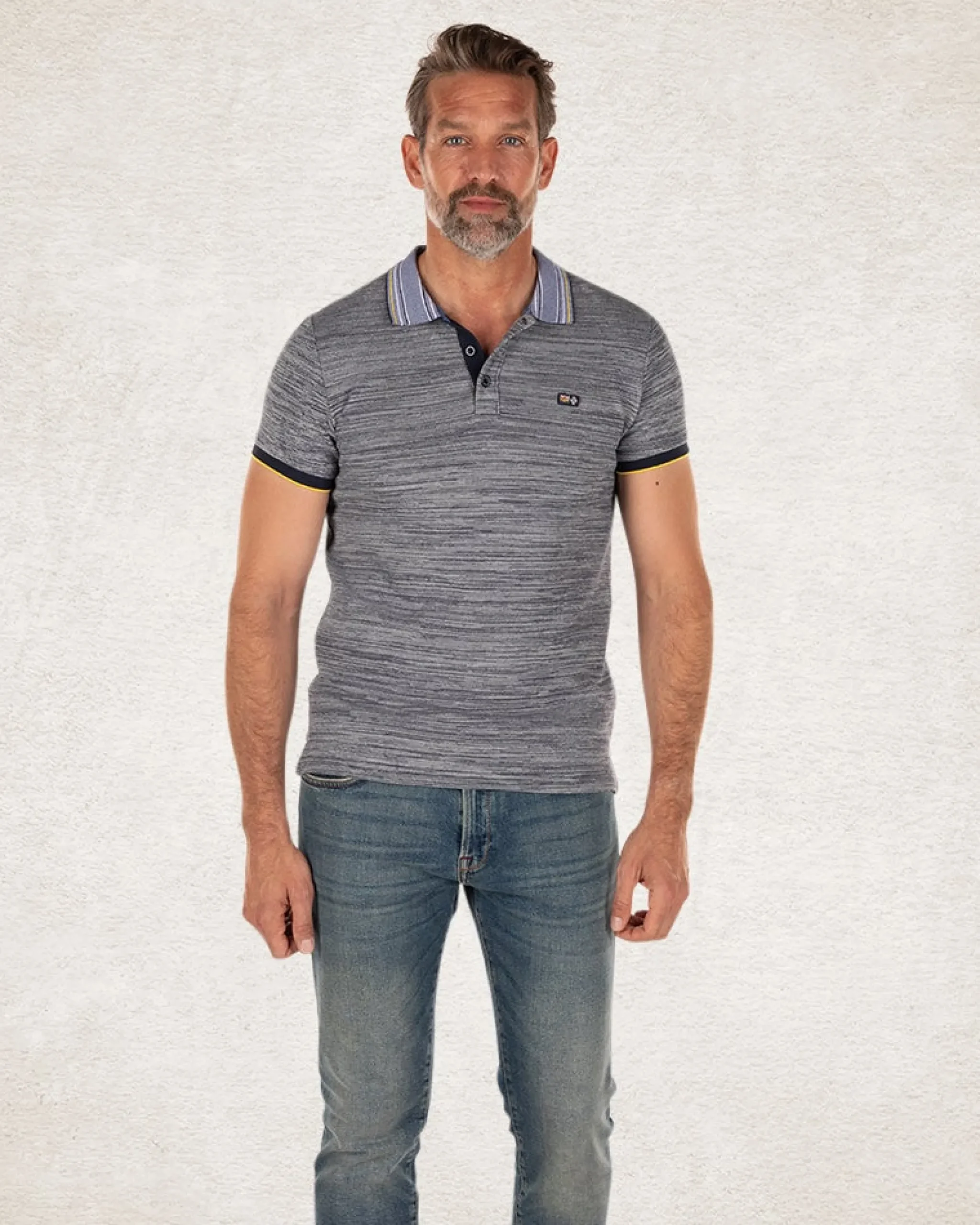 • Kraag met accentkleurige strepen