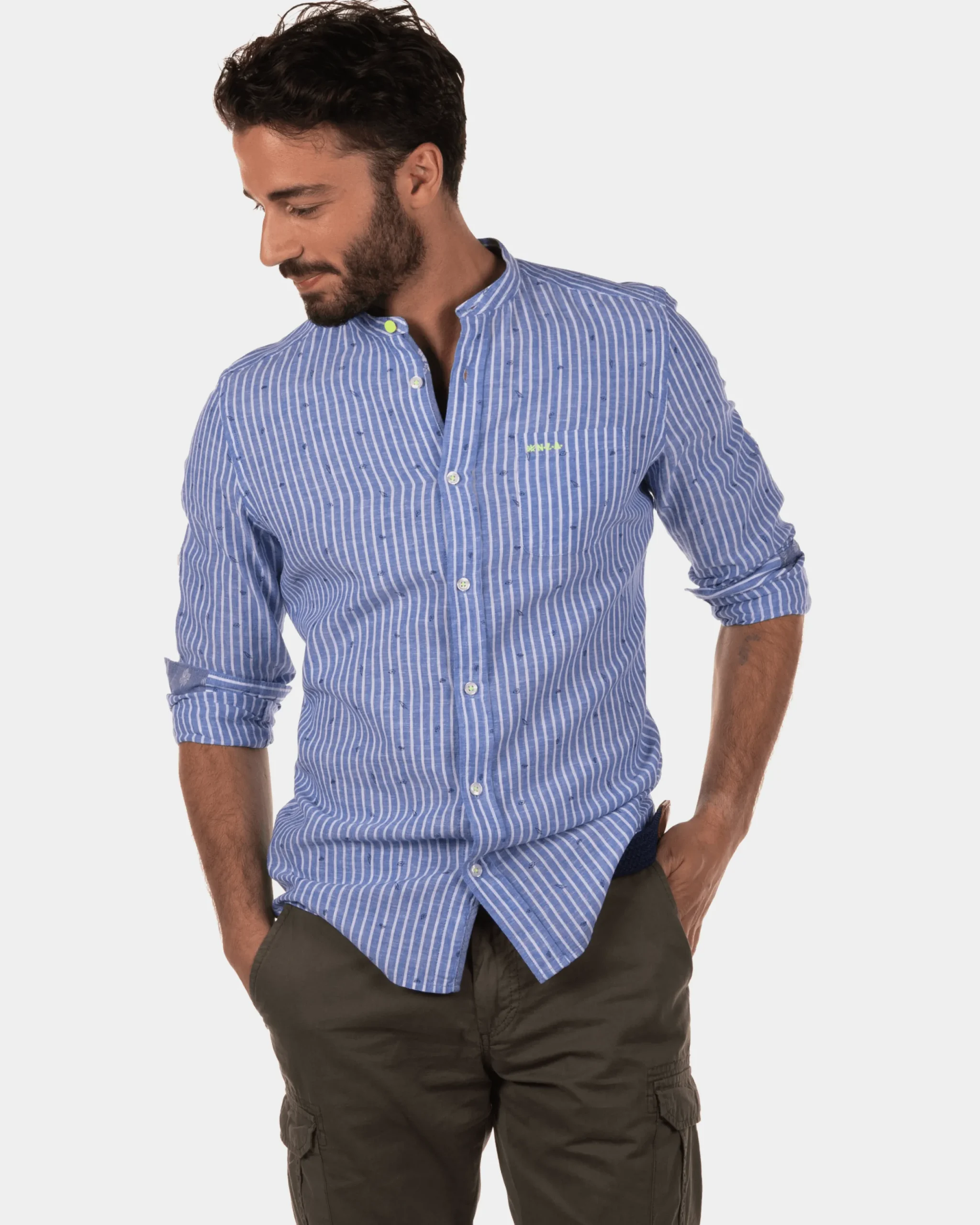 Rotonuiaha gestreept linnen overhemd zonder kraag – Chinese Blue